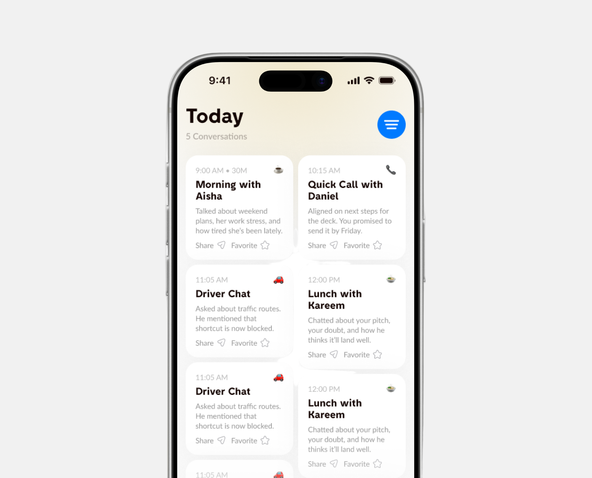 Each conversation gets its own summary, showing where, when, and what you talked about. It helps you recall details, follow up thoughtfully, and never lose track of what’s important.
